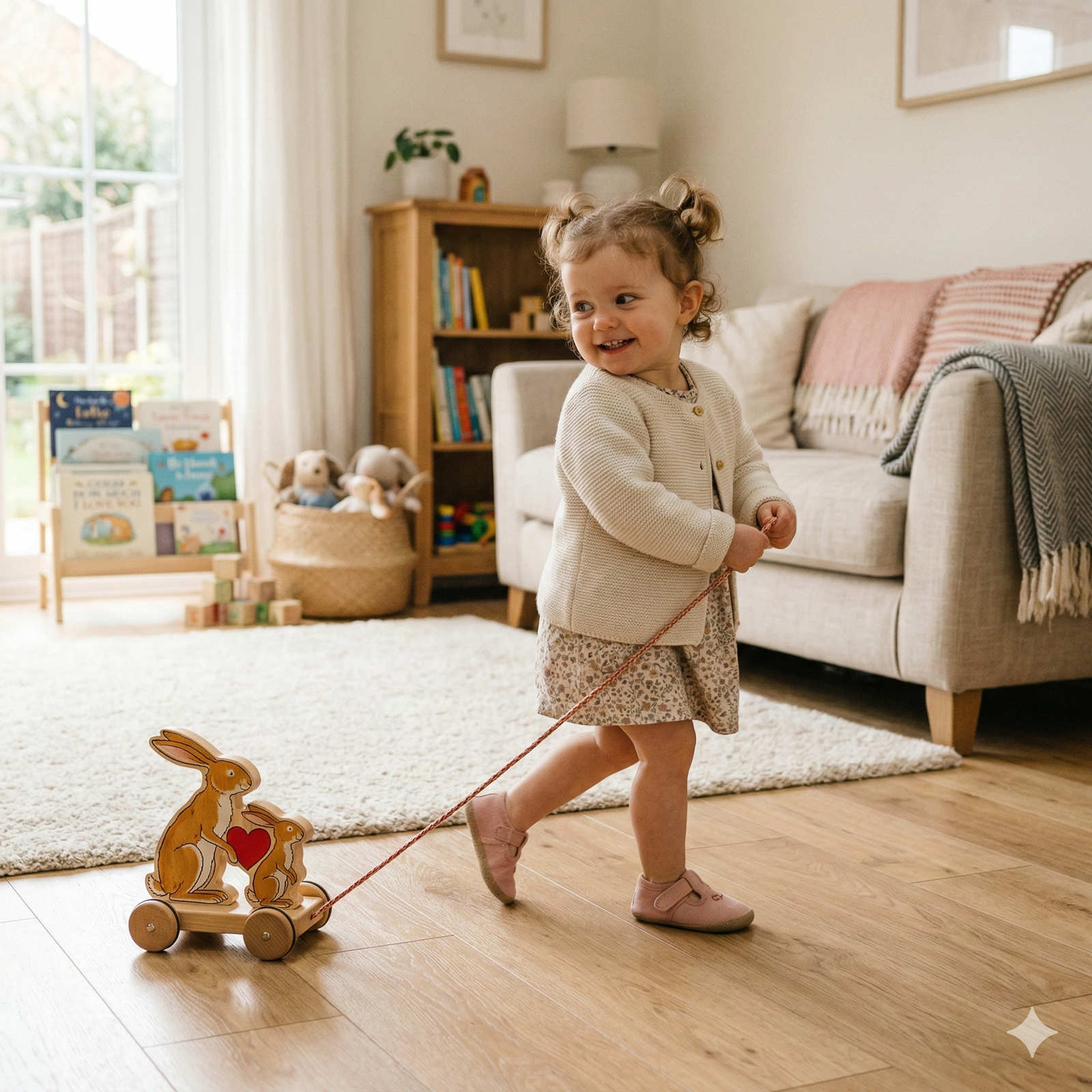 When your toddler is full of boundless energy and you just need a few minutes to finish prepping lunch, a captivating pull toy can be a true lifesaver. This beautifully crafted wooden set features the beloved characters from “Guess How Much I Love You,” instantly encouraging your little one to get moving and explore the house. It perfectly channels their active energy into meaningful, independent play while bringing a touch of literary magic and nostalgia to your living room.